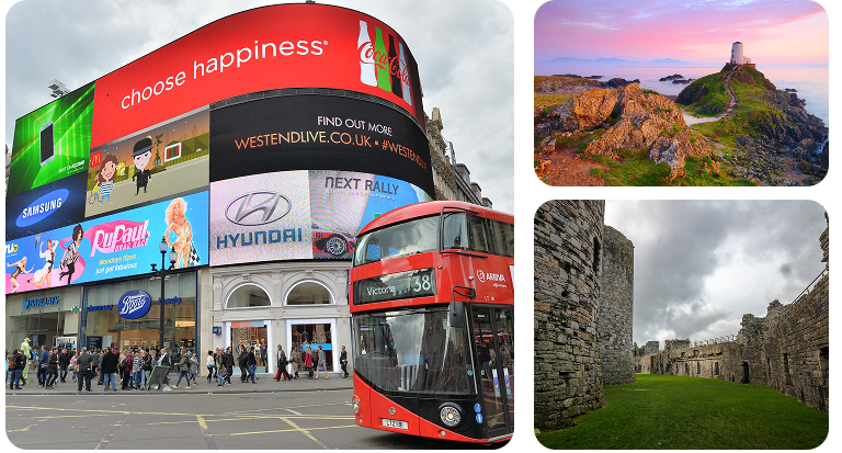 Some of the points of interest outside of Greater London include: the White Cliffs of Dover, Bournemouth Beach, Stonehenge, Oxford, Cambridge, Windsor Castle, Brighton Beach, High Force Waterfall, Woolacombe Beach, Canterbury Cathedral, Kynance Cove, St. Ives, and Lake District National Park, in England; Edinburgh Castle, Loch Ness, Stirling Castle, Loch Lomond and The Trossachs National Park, Isle of Skye, and the Scottish Highlands, in Scotland; Caernarfon Castle, Snowdonia National Park, Conwy Castle, Rhossili Bay, Pembroke Castle, Portmeirion, and the Tenby Beaches, in Wales; and Giant’s Causeway, Belfast Castle, Hillsborough Castle and Gardens, and Dark Hedges, in Northern Ireland.